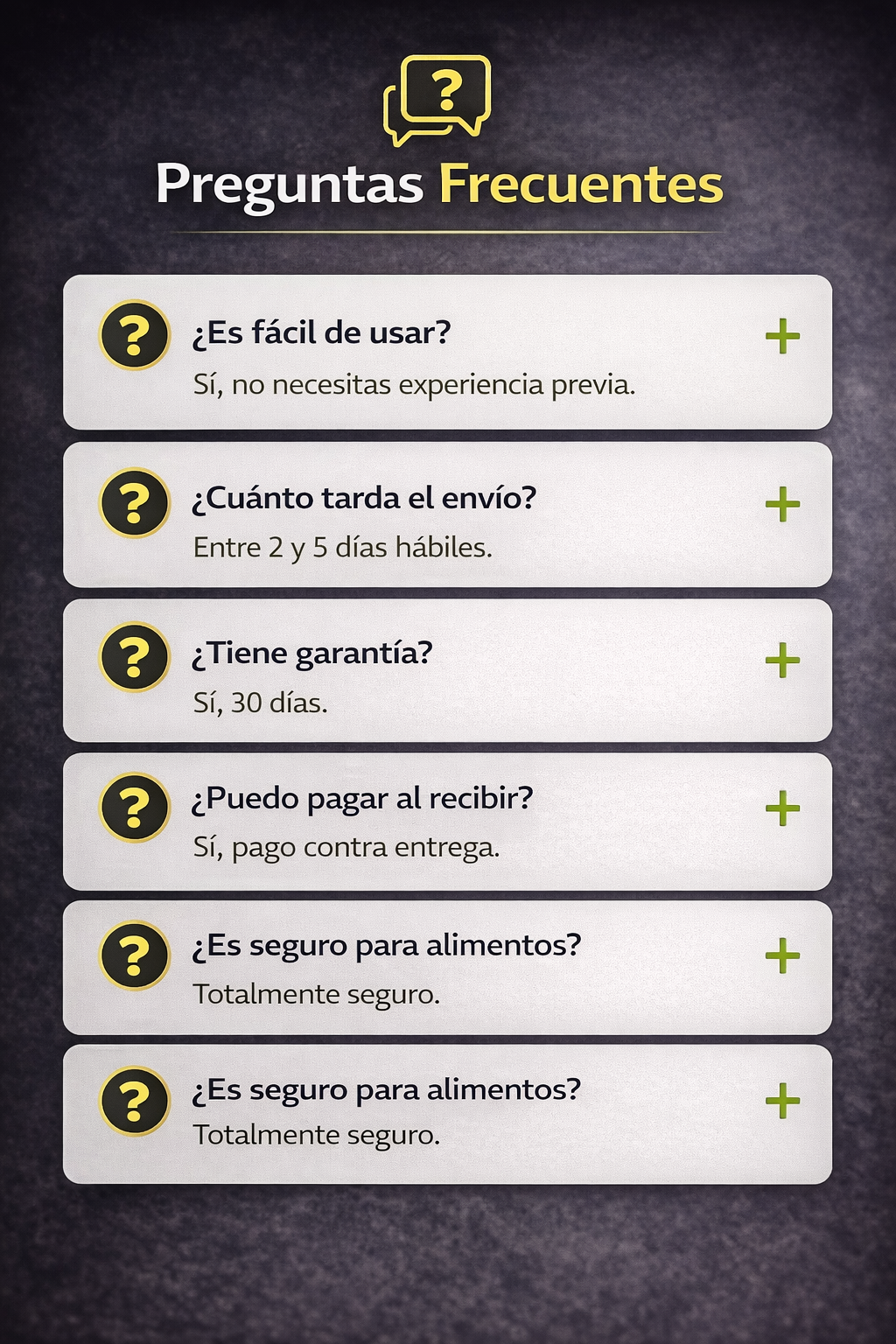 Durante este tiempo puedes solicitar una devolución o reemplazo en caso de que el producto presente fallas de fábrica o llegue en mal estado.